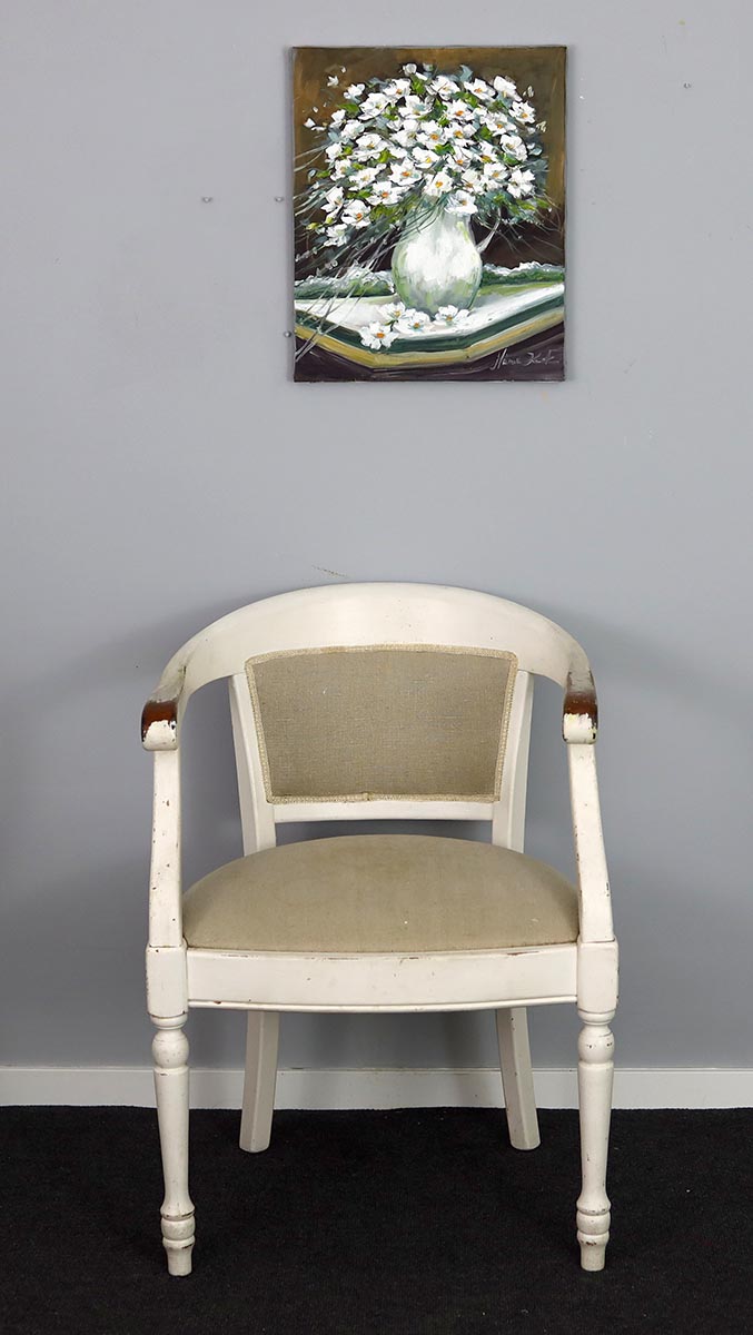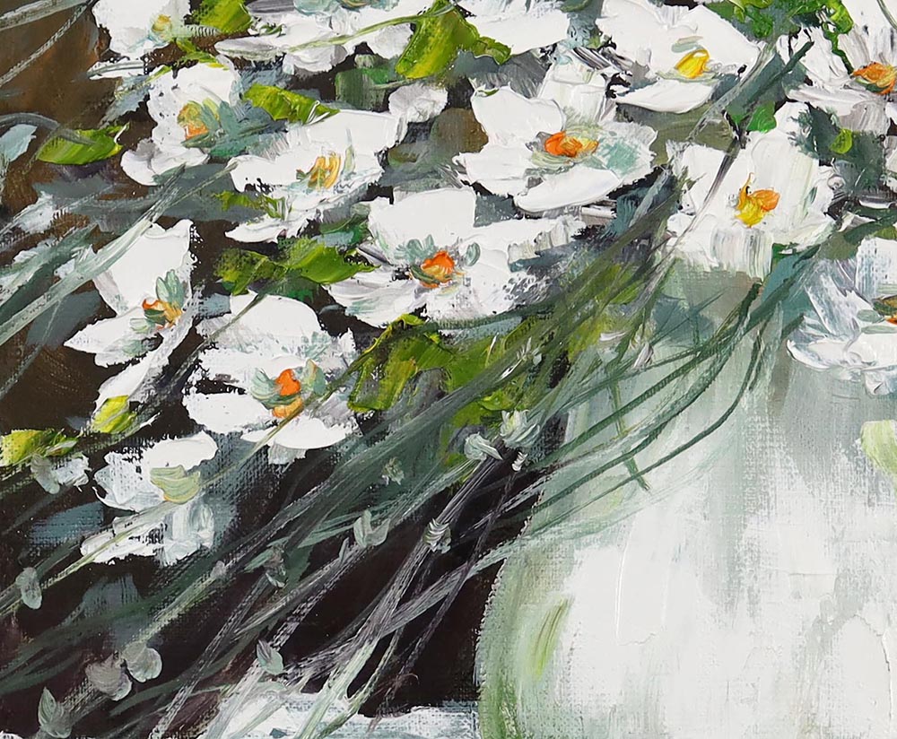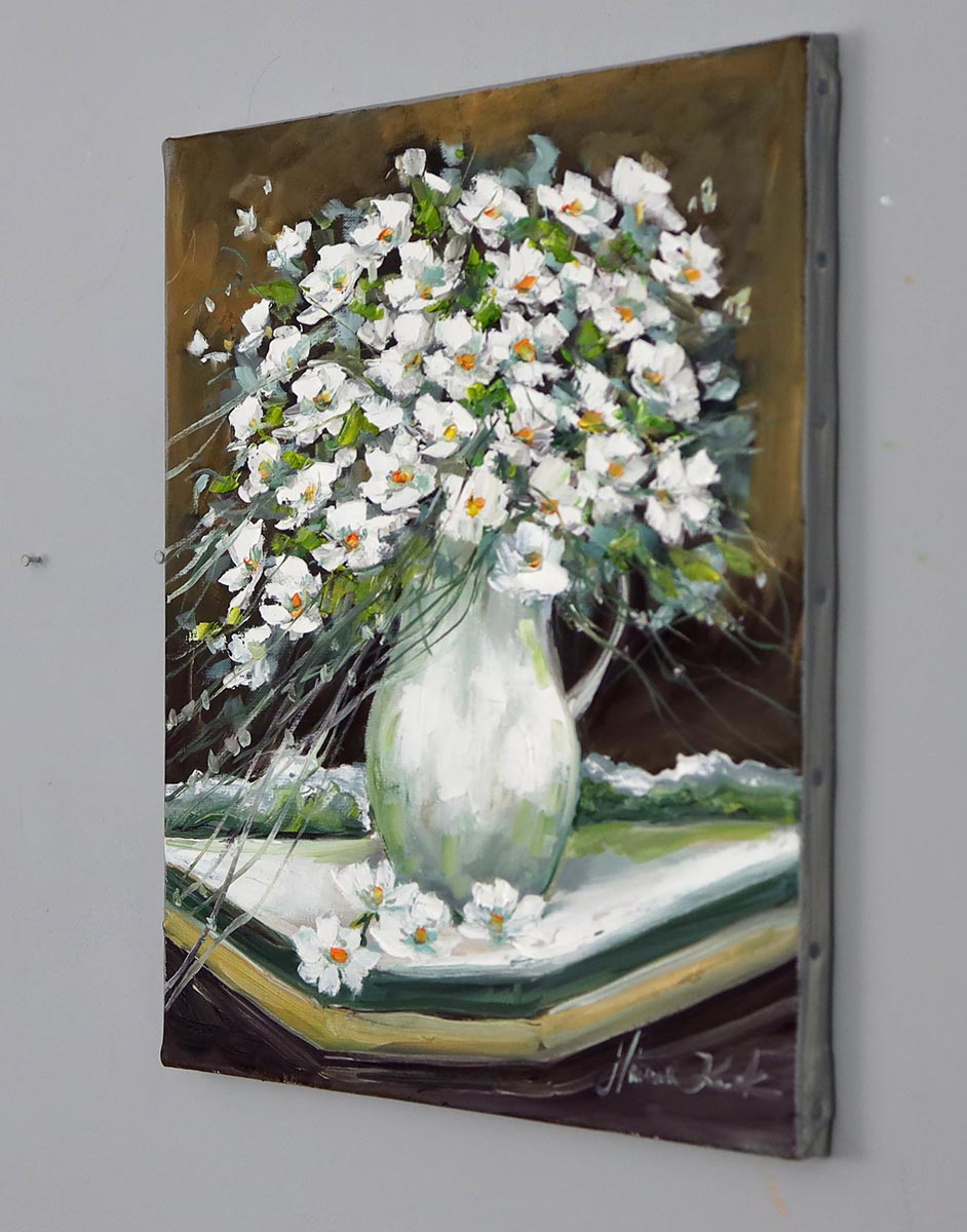 Ten obraz to wyjątkowa interpretacja klasycznej martwej natury, która łączy w sobie świeżość, lekkość i wyrafinowaną elegancję. Bogaty bukiet białych kwiatów, uchwycony dynamicznymi, pewnymi pociągnięciami pędzla, emanuje naturalnością i subtelnym ruchem, jakby delikatnie poruszał się w letnim powietrzu.