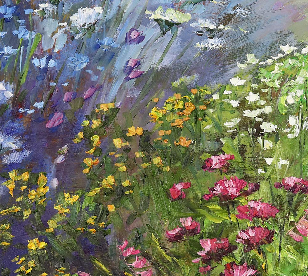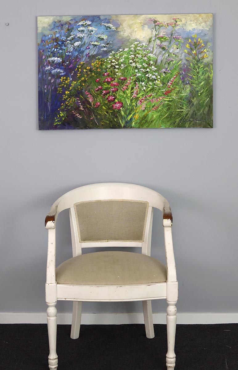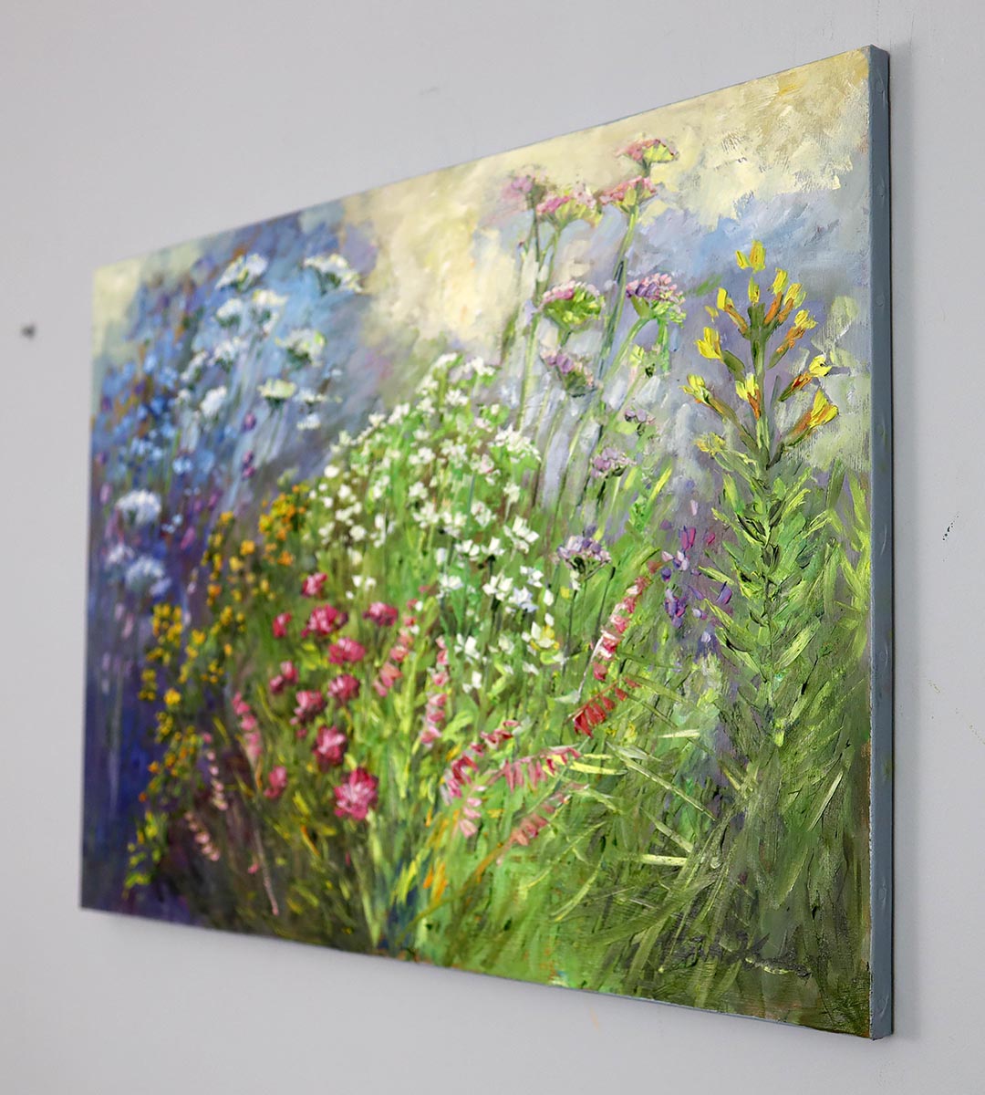 Ten obraz to wyjątkowo subtelna i jednocześnie pełna życia interpretacja dzikiej łąki – miejsca, w którym natura tworzy własną harmonię barw i światła. Kompozycja zbudowana jest z lekkich, swobodnych pociągnięć pędzla, dzięki czemu całość sprawia wrażenie ruchu i świeżości, jakby kwiaty kołysały się w letnim powietrzu.