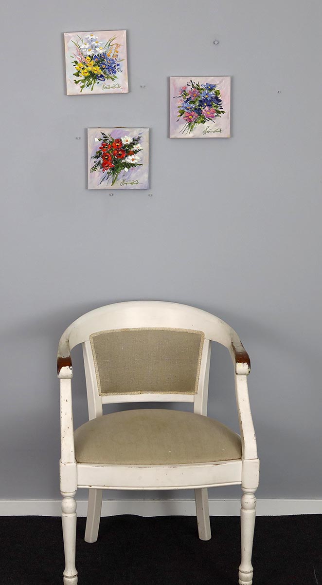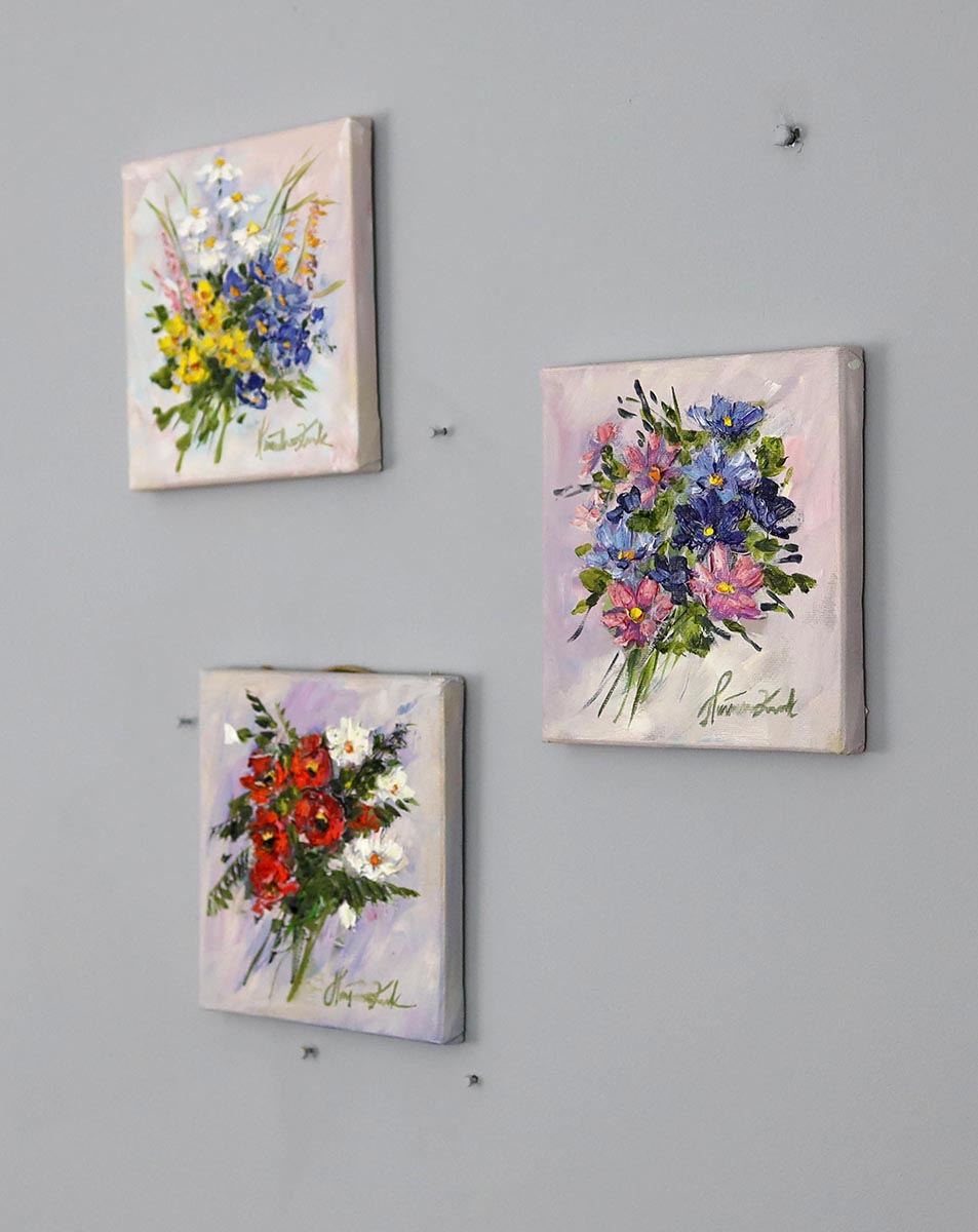 Obraz jest mokry i bezpieczna wysyłka mozliwa jest po 17 maja 2025. Komplecik 3, to trzy obrazy w wymiarach 20x20cm każdy.