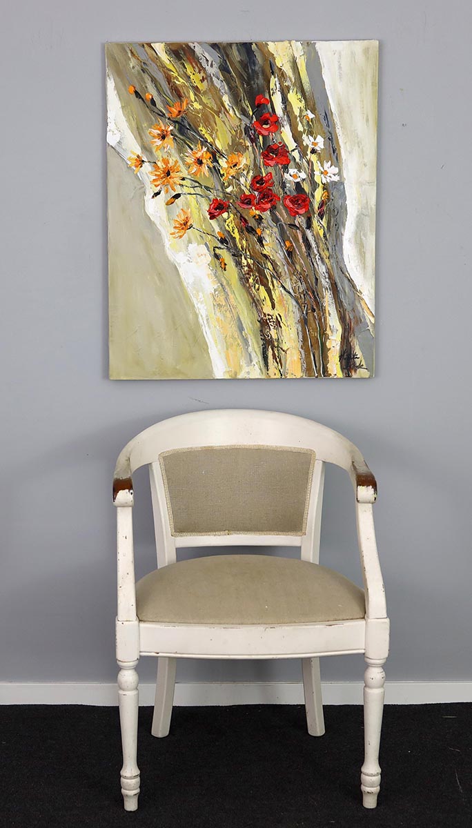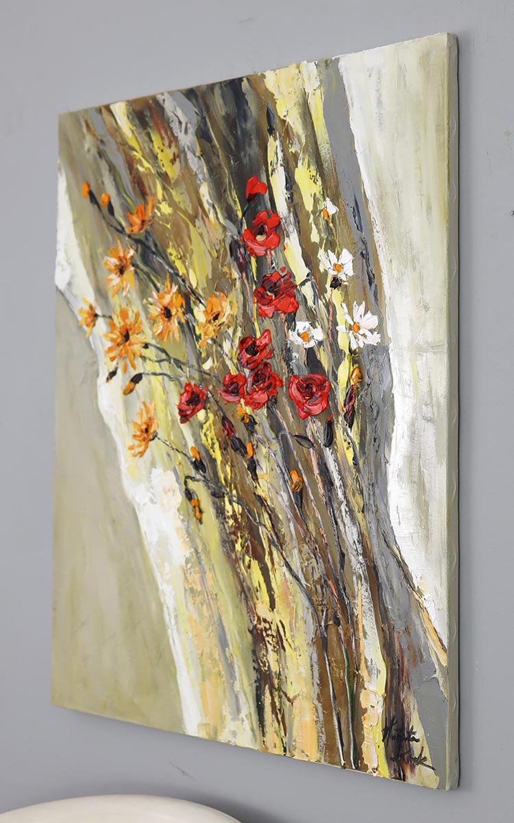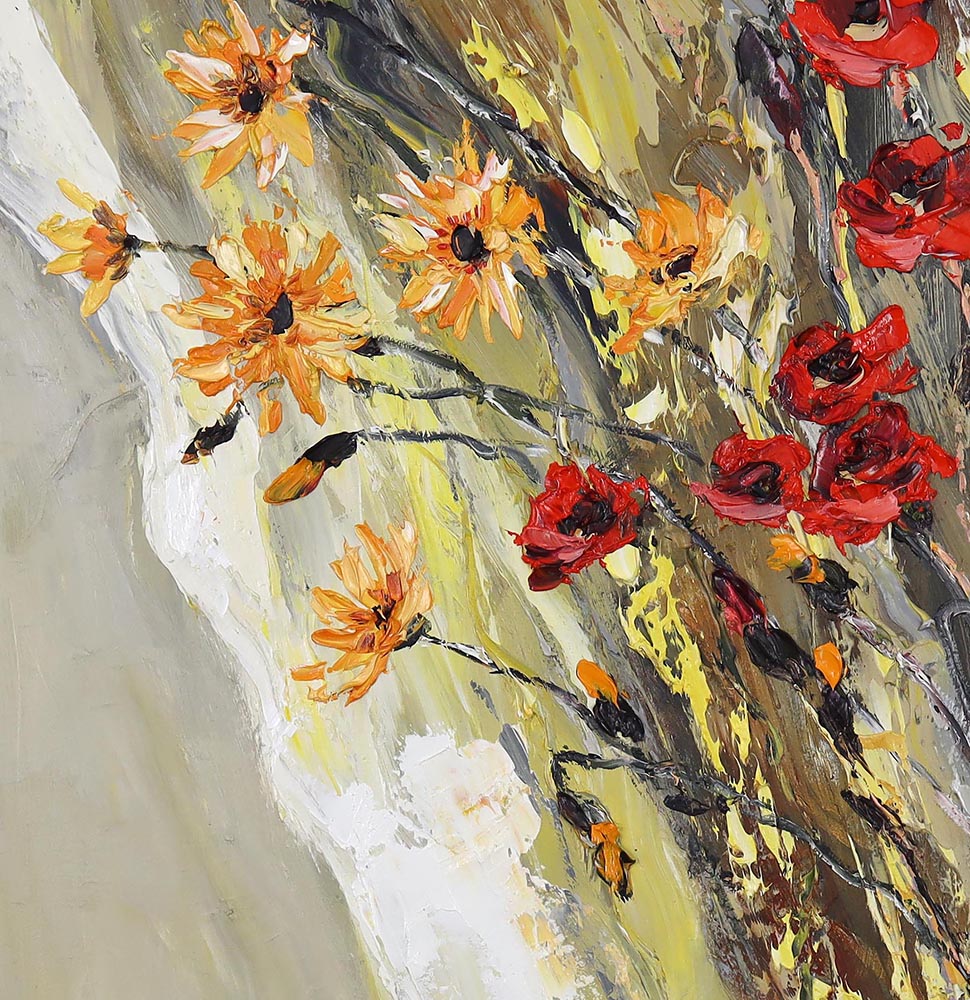 Ten obraz przyciąga uwagę od pierwszego spojrzenia – dynamiczna, diagonalna kompozycja i kontrast intensywnej czerwieni z ciepłymi tonami żółci i beżu tworzą niezwykle energetyczną, nowoczesną całość. Kwiaty zdają się być w ruchu, jakby uchwycone w chwili podmuchu wiatru – to malarstwo pełne życia i ekspresji.