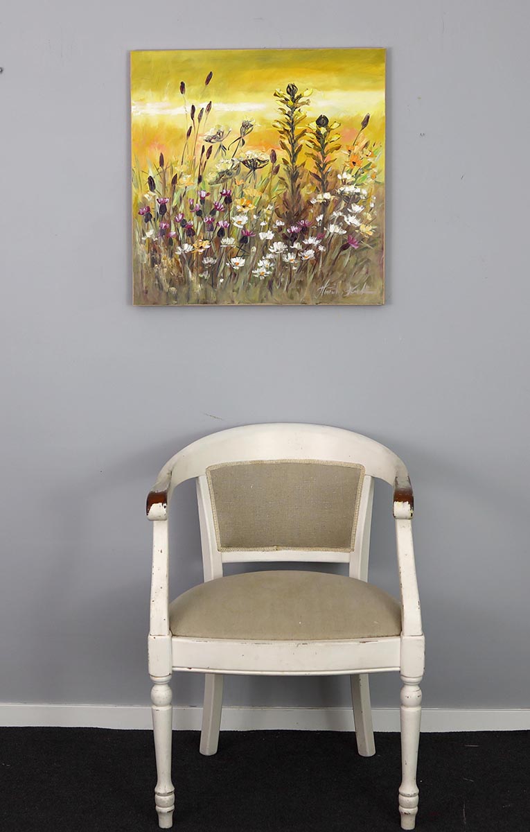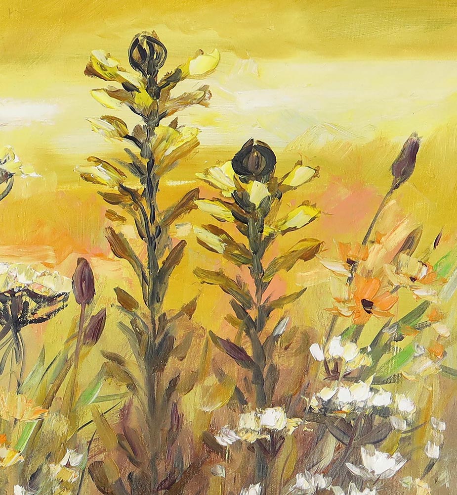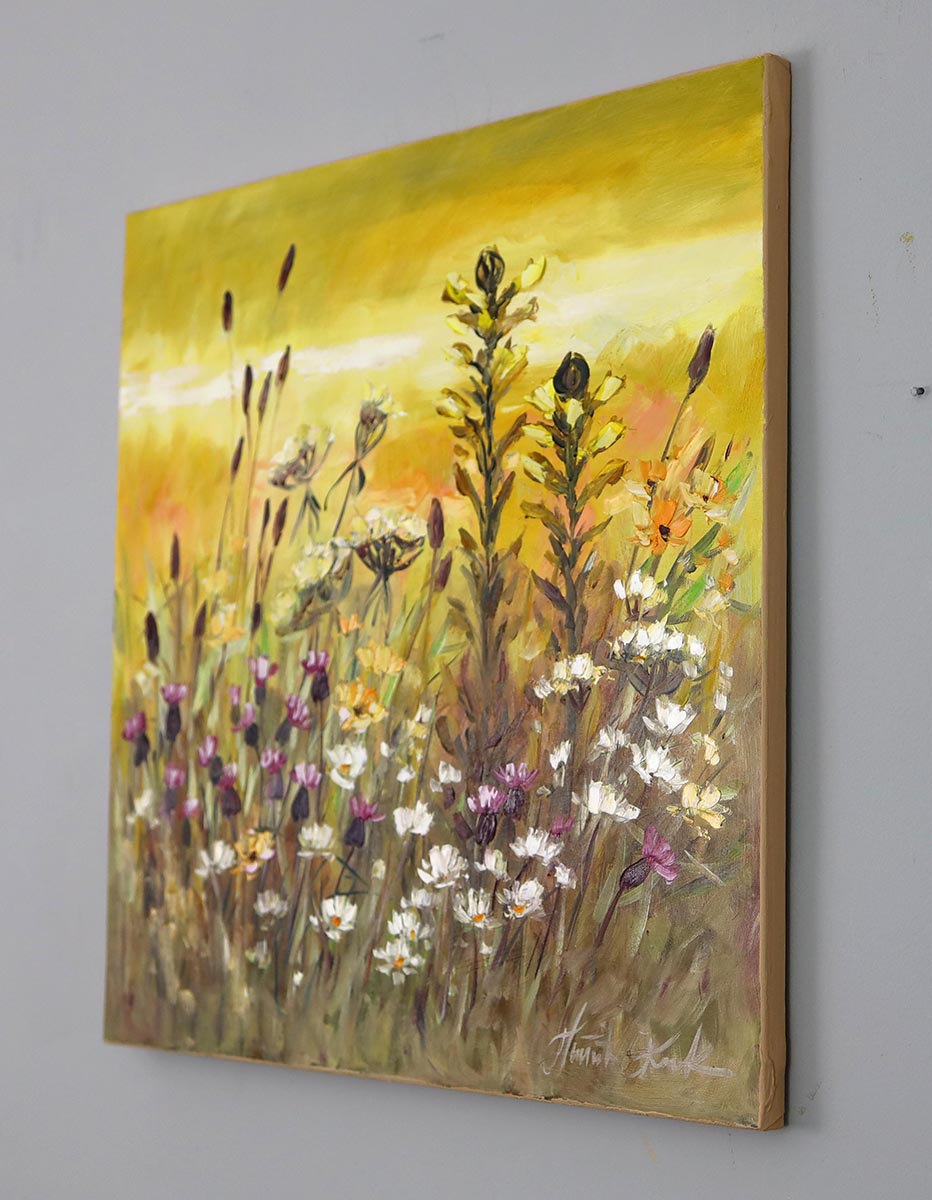 Ten obraz to malarska opowieść o letniej łące skąpanej w ciepłym, złotym świetle. Artystka uchwyciła moment, w którym dzika przyroda rozkwita pełnią barw – delikatne rumianki, drobne polne kwiaty i smukłe łodygi roślin tworzą dynamiczną, a zarazem harmonijną kompozycję.