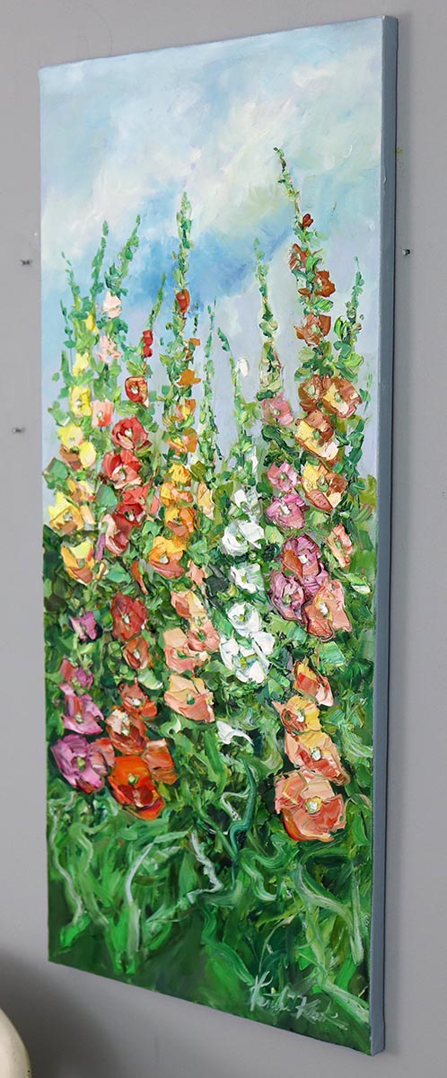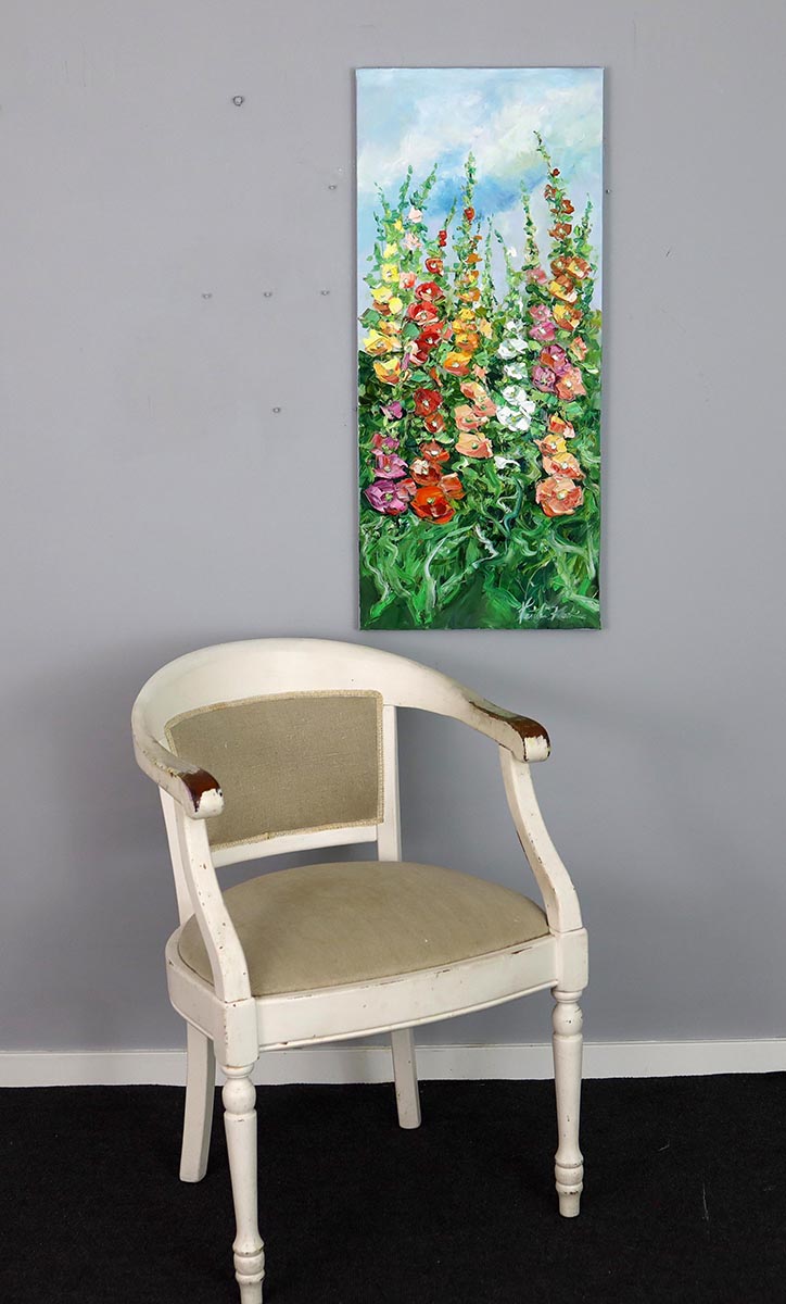 Ten pionowy obraz olejny przedstawia bujne malwy rozkwitające w pełni lata. Kompozycja zbudowana jest z dynamicznych, impastowych pociągnięć pędzla, które nadają kwiatom wyrazistą fakturę i niemal rzeźbiarską formę. Intensywne czerwienie, róże, żółcie i biele harmonijnie współgrają z soczystą zielenią liści oraz chłodnym, rozświetlonym błękitem nieba.