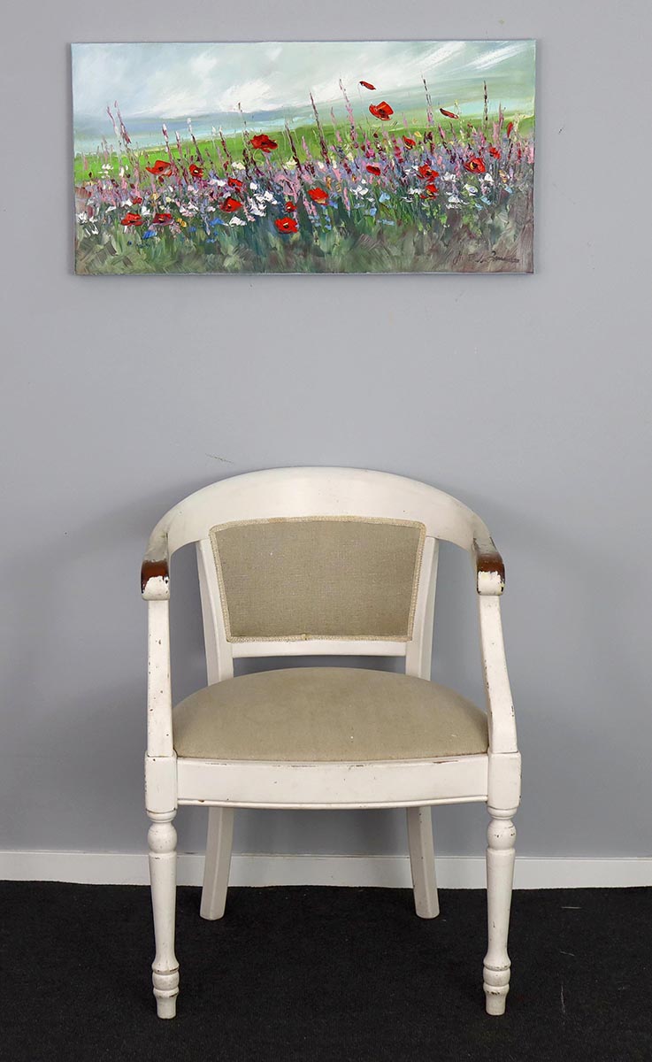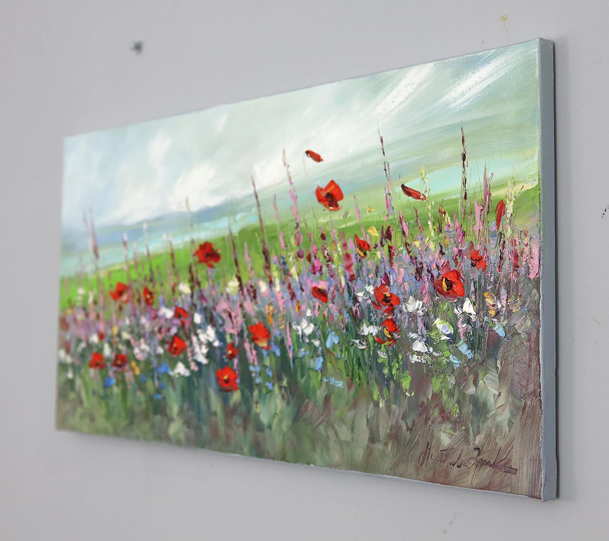 Pełna przestrzeni, światła i swobodnej ekspresji kompozycja autorstwa Małgorzaty Kruk zachwyca panoramicznym ujęciem kwitnącej łąki. To obraz, który oddycha – szeroki horyzont, delikatnie zarysowane niebo i dynamicznie rozkołysane kwiaty tworzą harmonijną, a jednocześnie energetyczną całość.