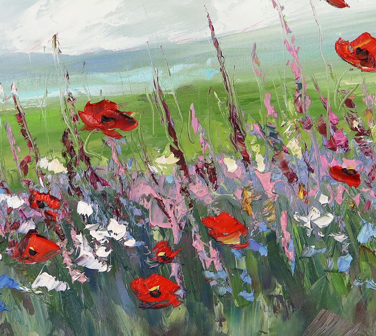 Intensywne czerwienie maków kontrastują z chłodnymi odcieniami zieleni i subtelnymi tonami fioletu oraz bieli. Zastosowanie wyrazistej faktury i zdecydowanych pociągnięć szpachli nadaje dziełu głębi oraz ruchu – kwiaty zdają się tańczyć na wietrze, a przestrzeń otwiera wnętrze na światło i świeżość natury.