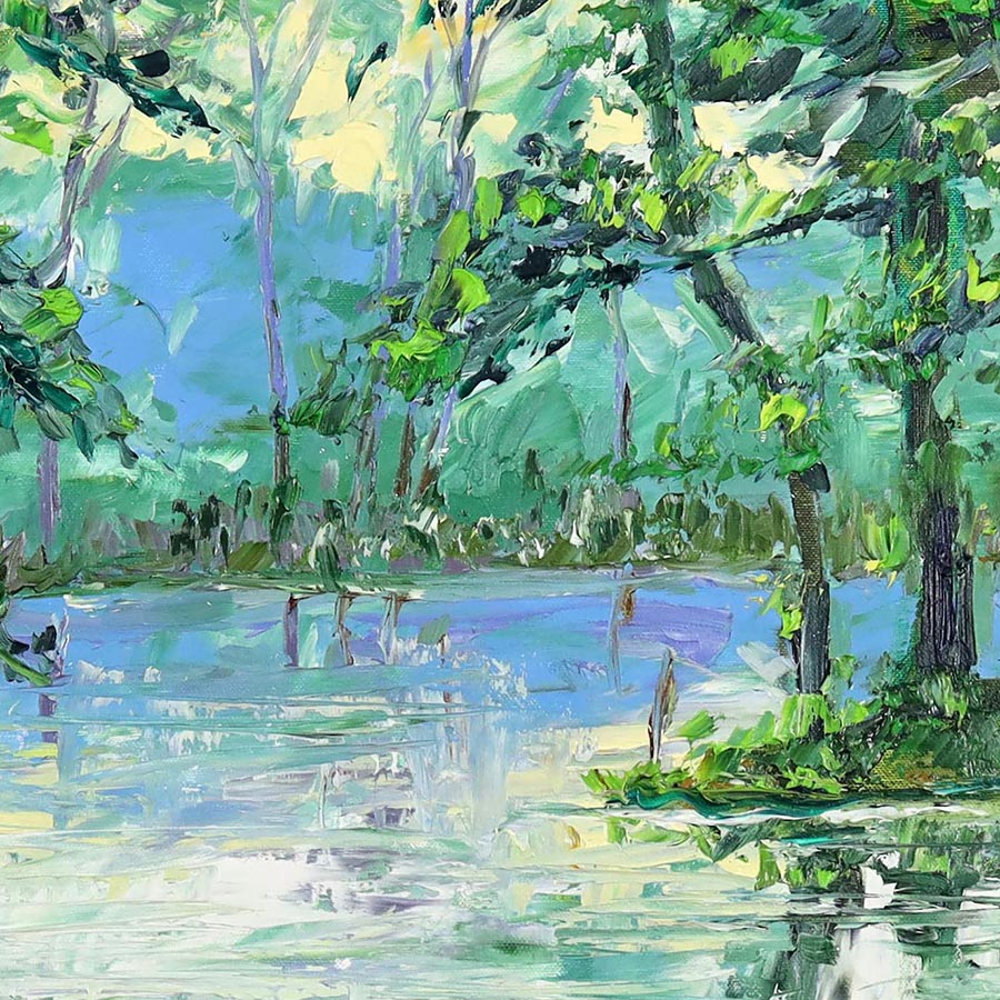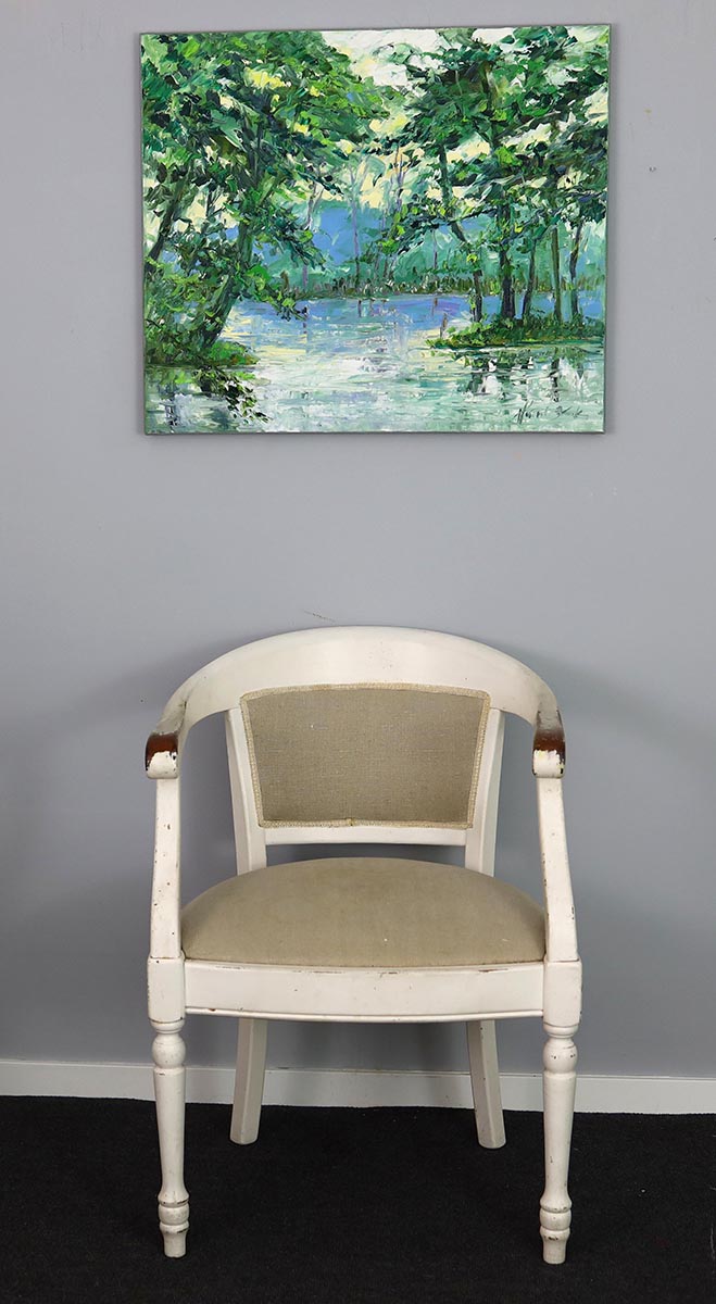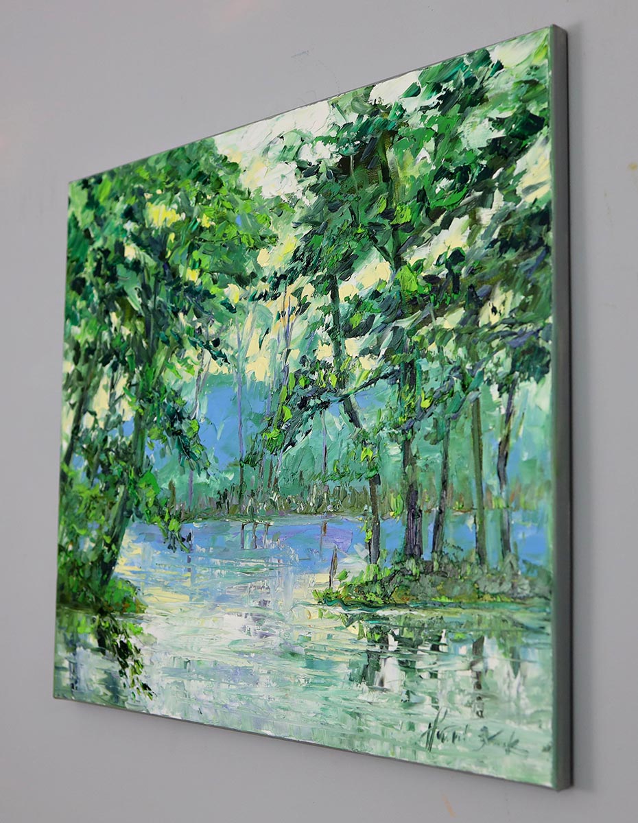 Ten olej na płótnie przyciąga uwagę już z daleka. Dynamiczne, a jednocześnie harmonijne pociągnięcia pędzla budują wrażenie świeżości, spokoju i kontaktu z naturą. Zieleń w wielu odcieniach oraz subtelne odbicia wody wprowadzają do wnętrza balans, który działa kojąco, ale jednocześnie dodaje energii.