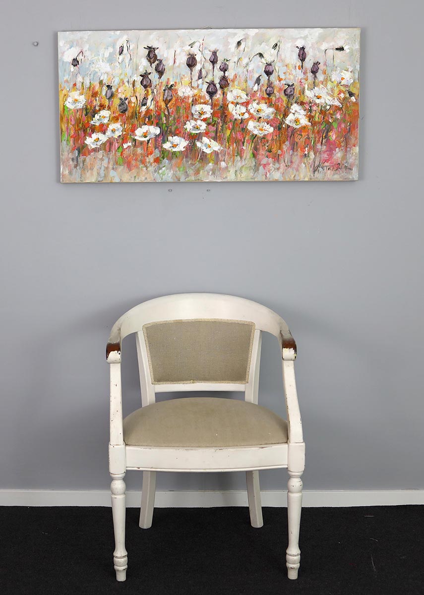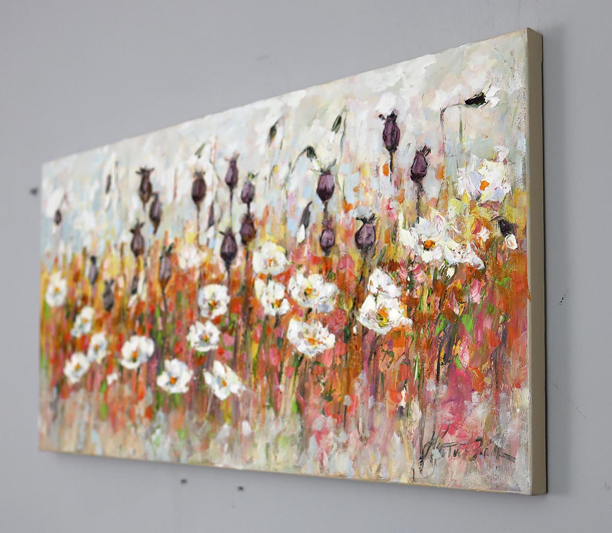 Na pierwszy plan wysuwają się białe płatki kwiatów – namalowane swobodnie, z widocznym gestem pędzla – które przyciągają wzrok i nadają całości eleganckiej lekkości. Charakterystycznym elementem obrazu są również ciemne, pionowe formy makówek, dodające kompozycji rytmu oraz nowoczesnego, dekoracyjnego wyrazu. Tło w stonowanych szarościach i beżach pięknie równoważy intensywność barw, sprawiając, że dzieło jest wyraziste, ale nie przytłacza wnętrza.