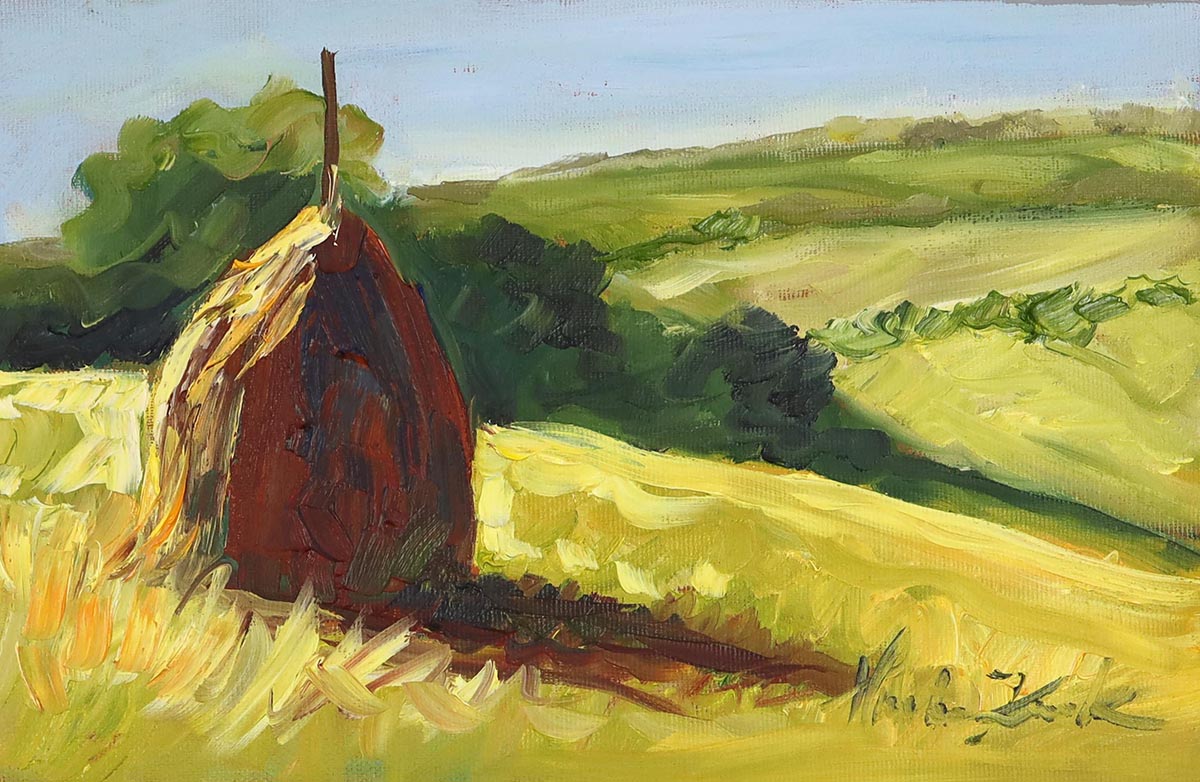 To opowieść o ciszy letniego pola i rytmie natury. Motyw stogów – prosty, niemal archetypiczny – został ujęty w sposób malarski, żywy i pełen światła. Złociste żółcie zbóż, ciepłe brązy słomy i soczyste zielenie horyzontu budują pejzaż, który emanuje spokojem i nostalgią.