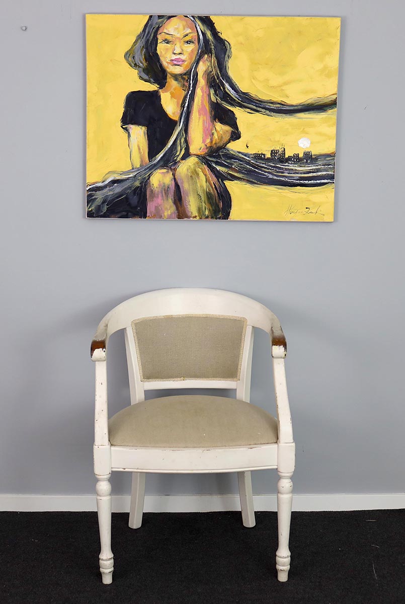 Wyrazista faktura farby olejnej oraz zdecydowane, ekspresyjne pociągnięcia pędzla budują napięcie i rytm obrazu. To nie jest dosłowny portret – to stan ducha, opowieść o chwili zatrzymania, refleksji i intymności. Obraz świetnie odnajdzie się we wnętrzach współczesnych, minimalistycznych, loftowych, ale także tam, gdzie sztuka ma być mocnym akcentem i punktem rozmowy.