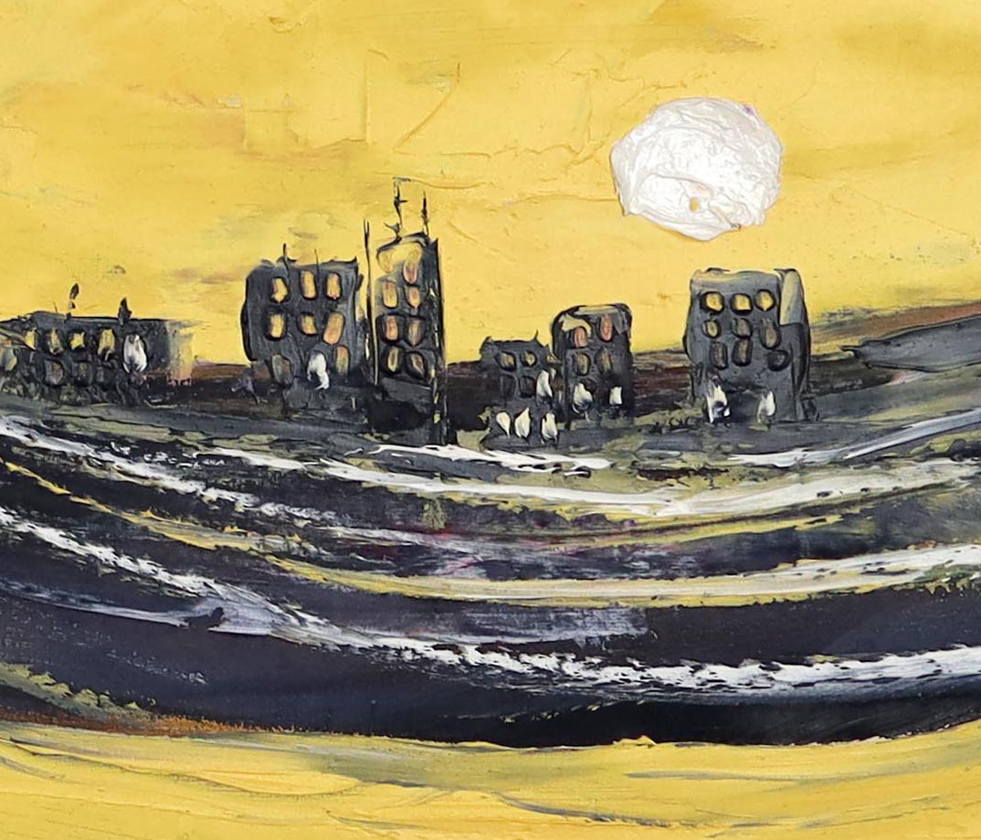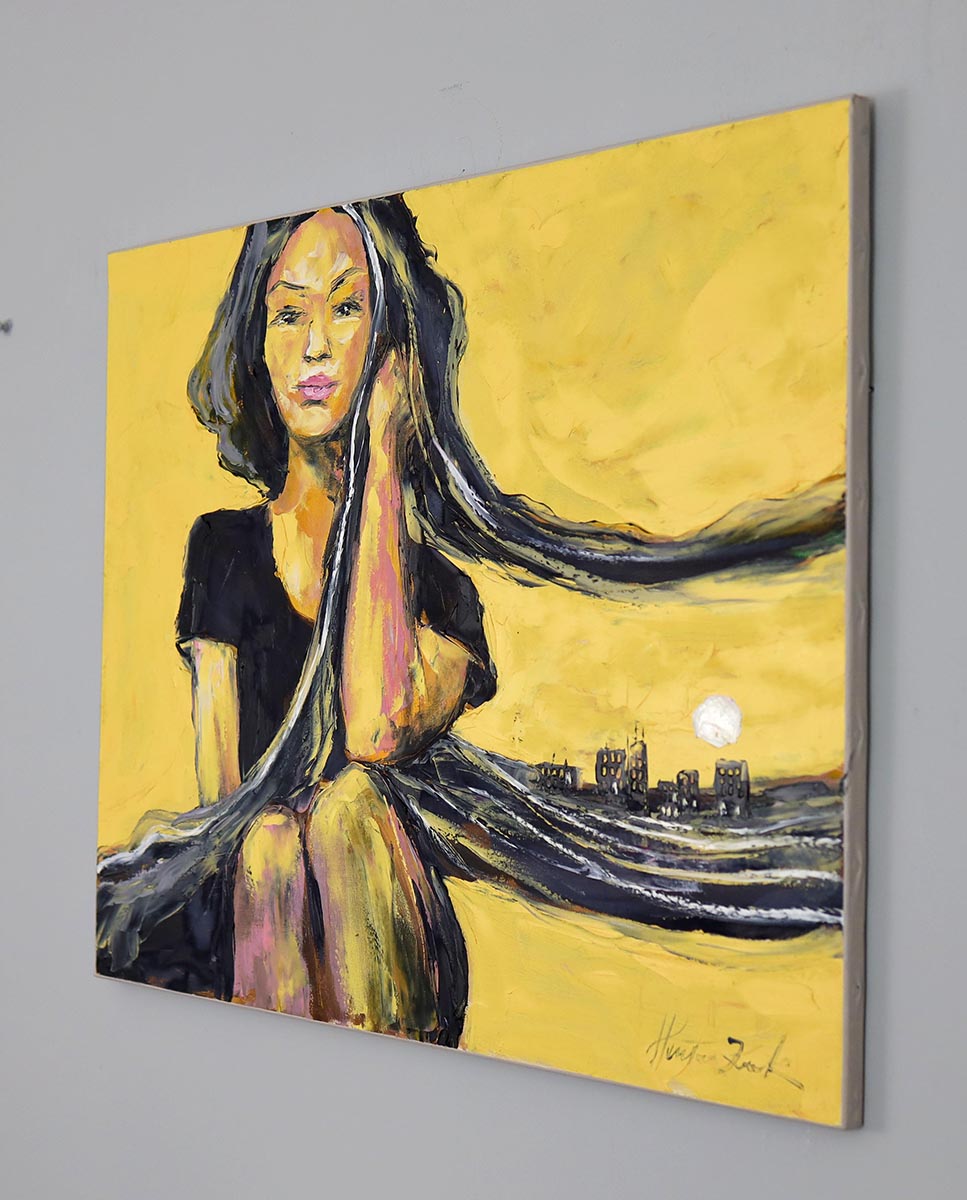 „Zamyślenie” to obraz, który przyciąga ciszą. Postać kobiety zanurzonej w myślach została uchwycona w chwili wewnętrznego skupienia – pomiędzy światłem a emocją. Intensywne, ciepłe tło w odcieniach żółci kontrastuje z głębokimi czerniami i dynamiczną linią włosów, nadając kompozycji wyrazistość i nowoczesny charakter.